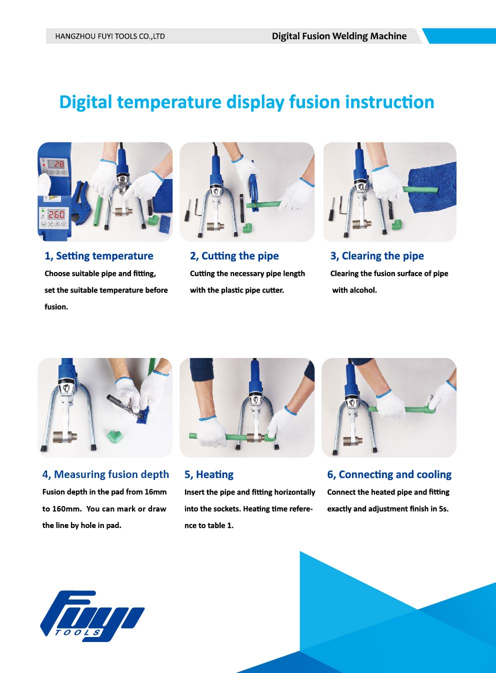 Hoe een digitale socket-fusielasmachine te gebruiken 1. Temperatuur instellen Kies geschikte buizen en fittingen, stel de geschikte temperatuur in 2. Afsnijden van de buis Snijd de benodigde buislengte af met de kunststof buizensnijder. 3. De buis reinigen Het smeltoppervlak van de buis reinigen met alcohol 4. Fusion-diepte meten Fusion-diepte in pad van 16 mm tot 160 mm. U kunt de lijn markeren of tekenen door een gat in het kussen te maken. 5. Verwarming Steek de buis en fitting horizontaal in de moffen. Verwijzing naar verwarmingstijd naar instructieboek in de set. 6. Aansluiten en koelen Verwarmde leiding en fitting exact aansluiten en afwerking aanpassen in 5s.